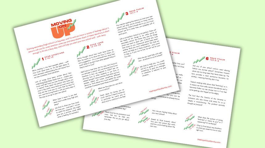 Moving On Up is a devotional for 11 year olds as they start secondary school.